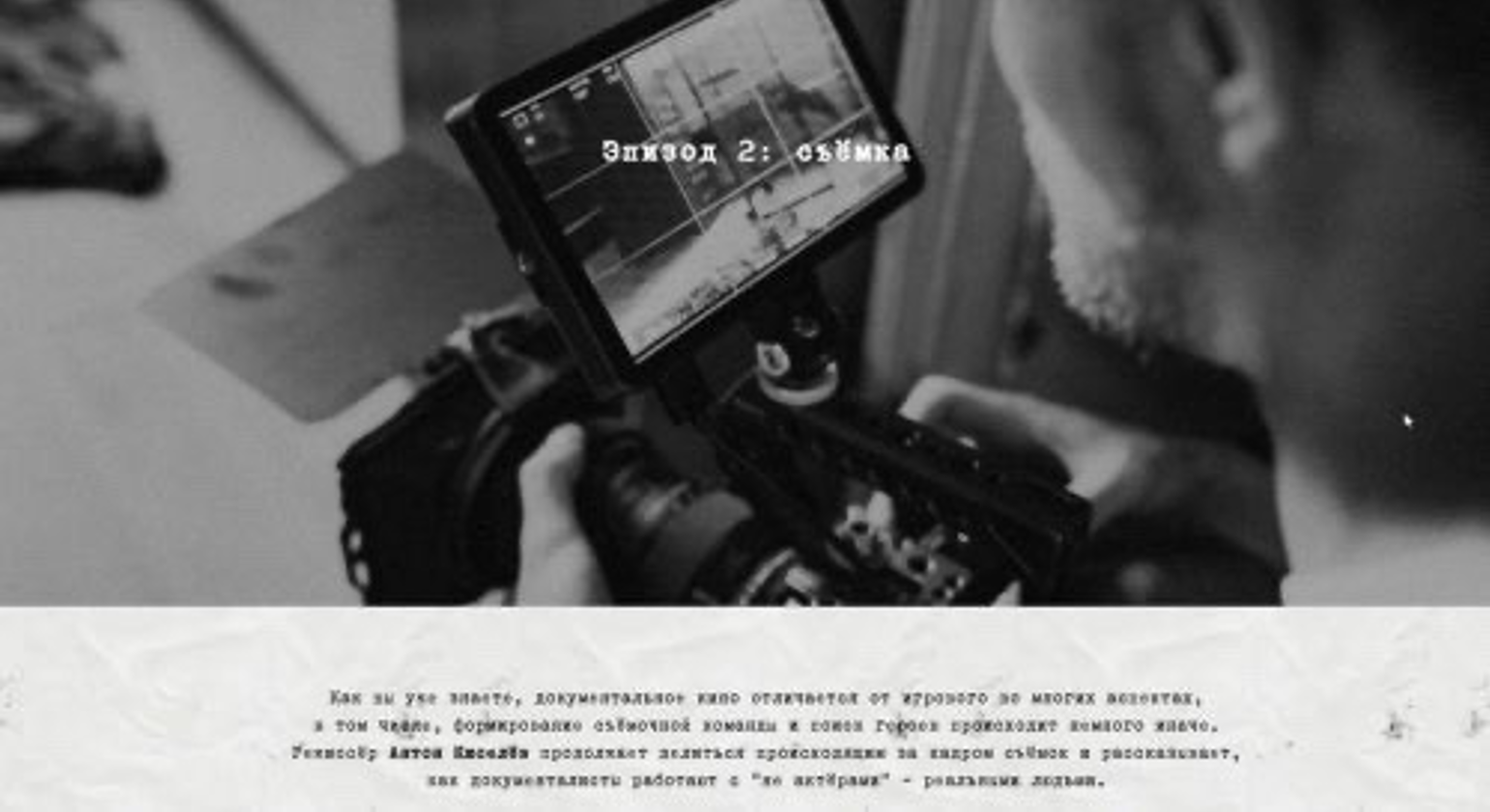 Для проекта авторы поговорили с красноярскими режиссёрами Антоном Киселёвым, Филиппом Устиновым и Владимиром Тарасовым. Они рассказали об основных этапах производства, познакомили с закулисьем съёмочного процесса и поделились интересными историями со съёмок.